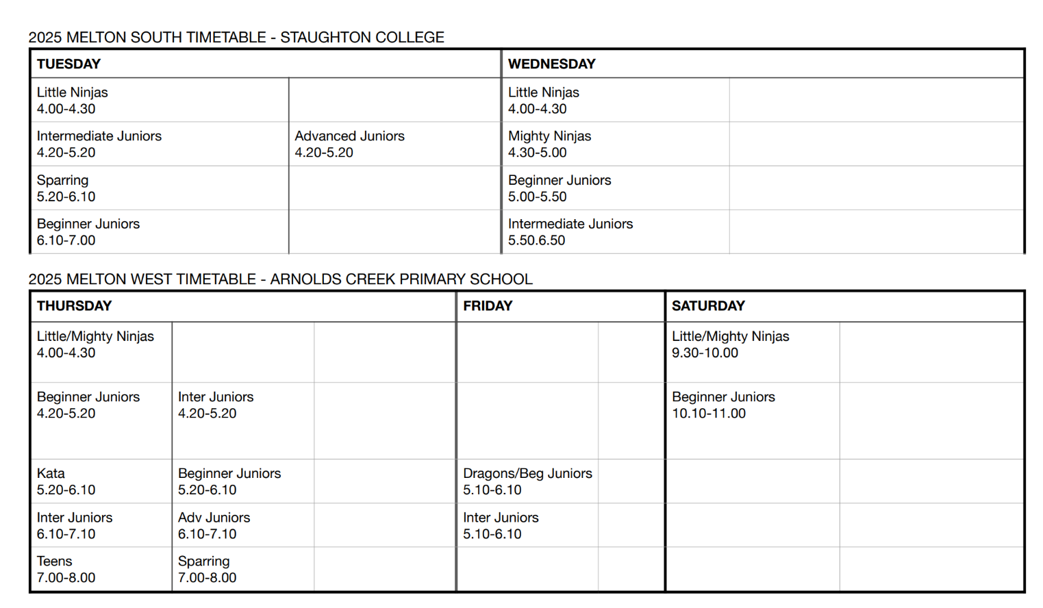 Classes are held at Staughton College on Tuesday and Wednesday as well as Arnolds Creek Primary School on Thursday, Friday & Saturday.