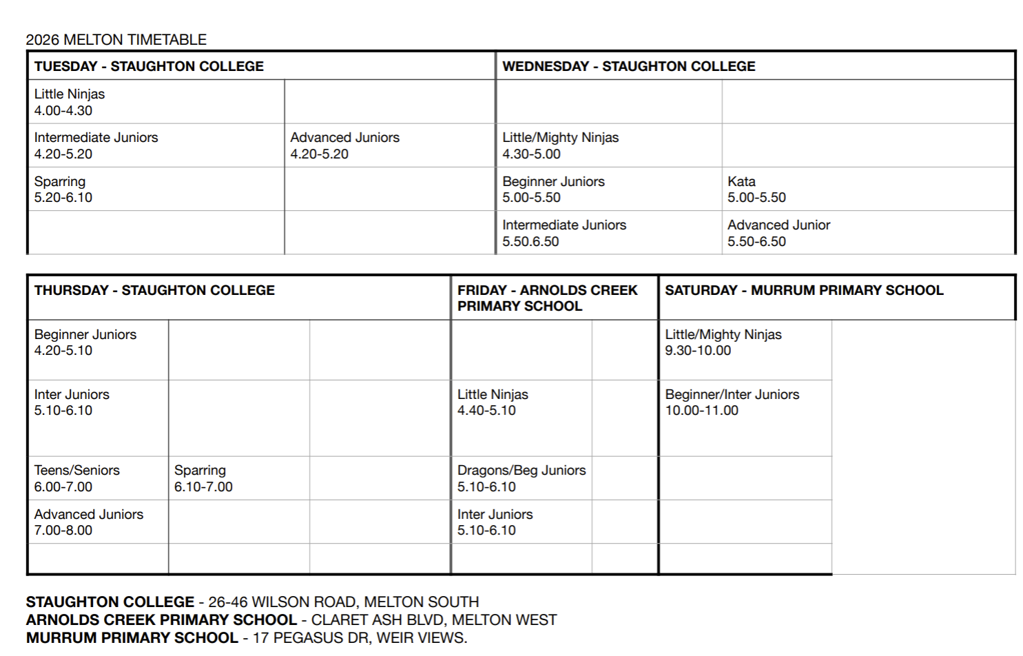 Classes are held at Staughton College on Tuesday, Wednesday and Thursday, at Arnolds Creek Primary School on Friday and at Murrum Primary School on Saturday.